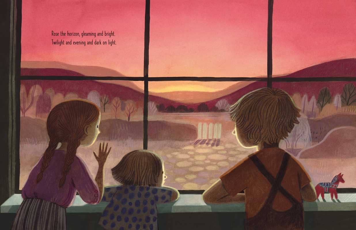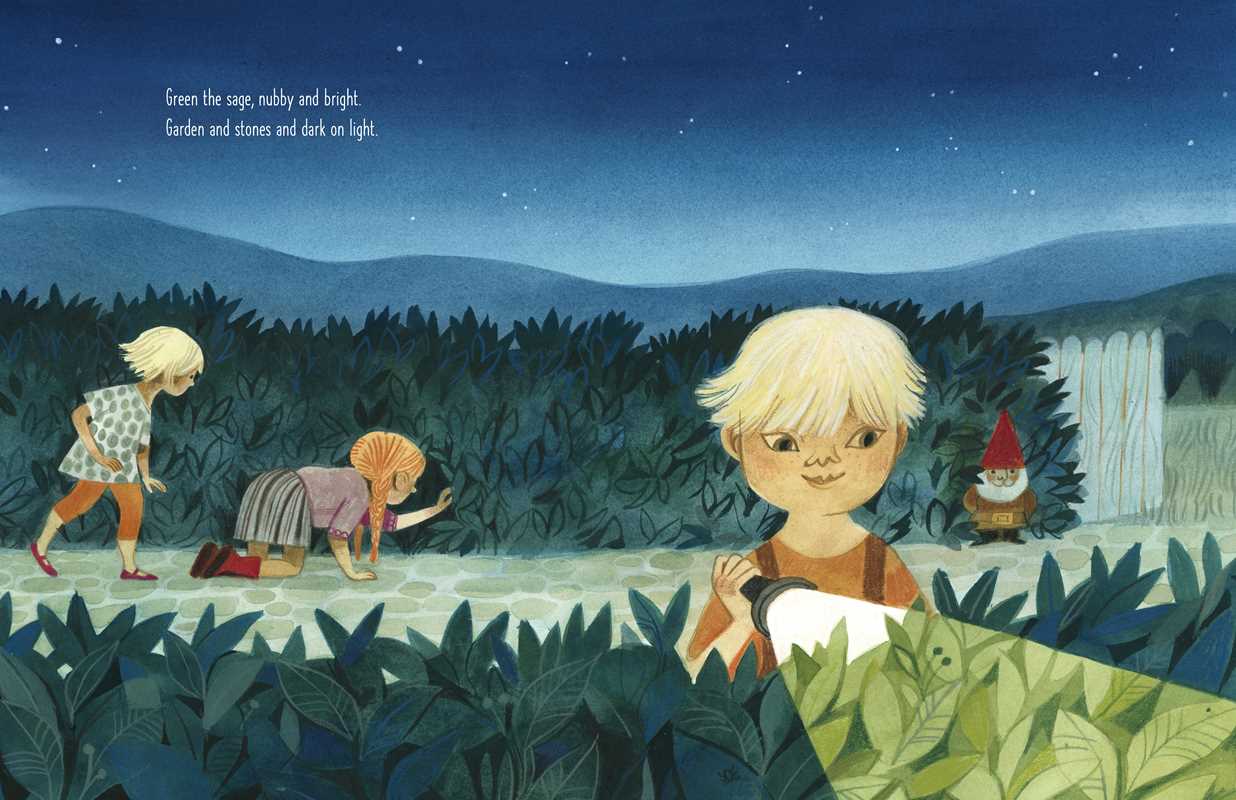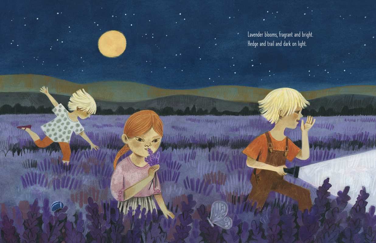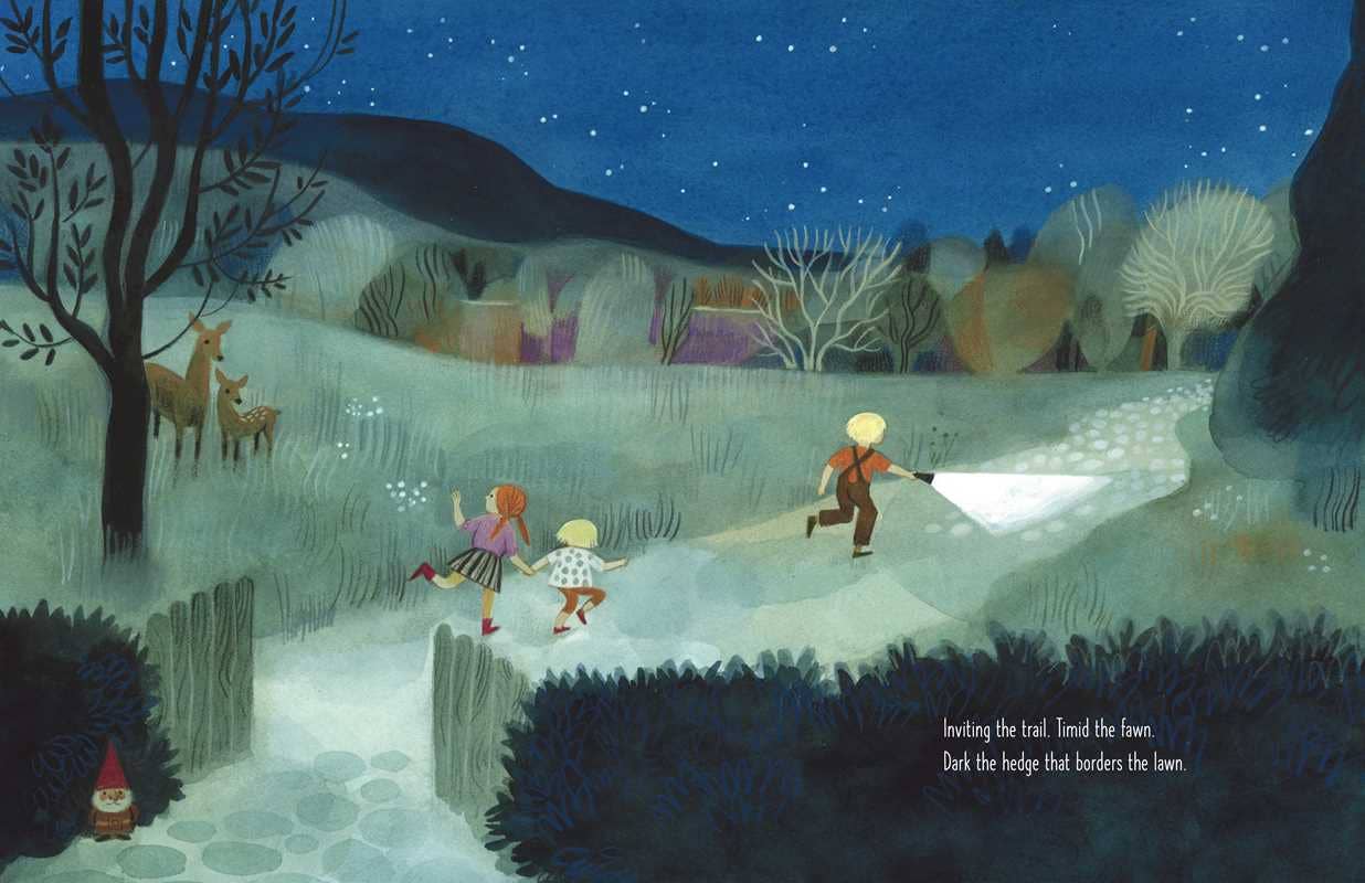 When the family dog trots away from the house at sunset, three siblings tumble out the door to go find him. Soon they find themselves immersed in the luminous colors, shades, and shadows of nature at night—both dark and light. They wander through moonlit lavender meadows, past a timid fawn, beneath a snowy white owl, and much, much more as the night deepens until, at last, they find their sneaky pup.