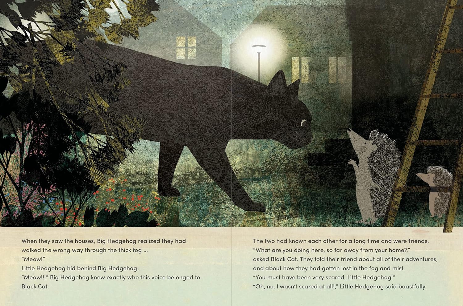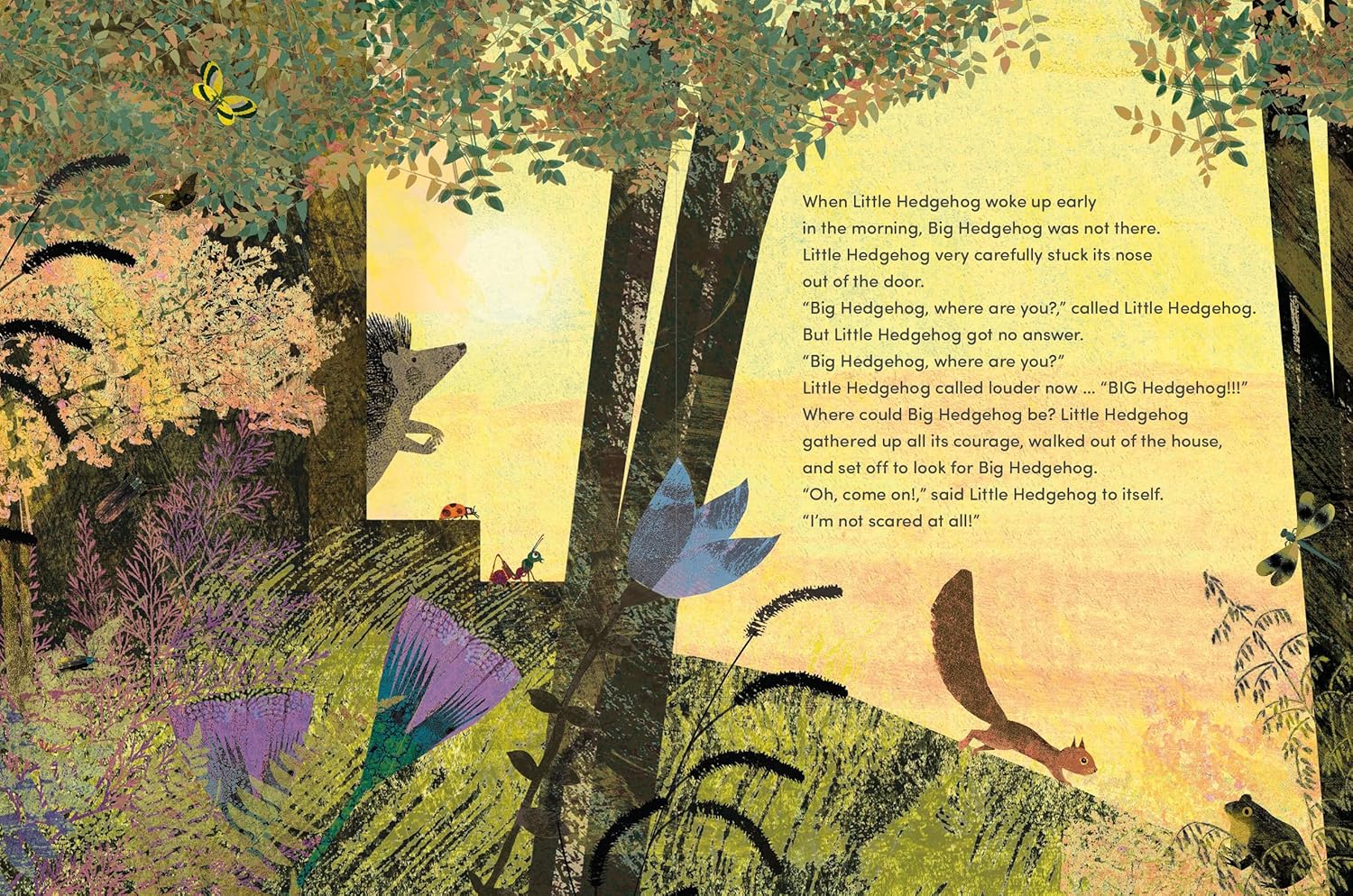 From dark basements to deserted streets, swooping birds to cars’ glaring headlights, menacing foxes to friendly cats, the two friends spend a day and evening confronting things that are both frightful and harmless. As the two hedgehogs walk through their neighborhood, they talk casually about their fears and strategies for dealing with them—whistling, holding hands, counting, being still, and accepting kindness. Few children’s illustrators working today are able to capture nature’s lush colors and textures quite like Teckentrup.